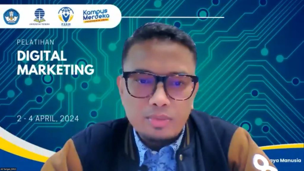 Pelatihan Digital Marketing diselenggarakan pada Selasa-Kamis , 2-4 April 2024 secara daring melalui Zoom Meeting. Pelatihan ini turut dihadiri oleh Kepala Pusat Sumber Daya Manusia memberikan laporan kegiatan dan Plt. Direktur Pemasaran dan Kerja Sama memberikan arahan dan pembukaan kegiatan. Pelatihan ini melibatkan sejumlah narasumber berpengalaman yaitu Yohan Eko Kristanto, Putra Dev, dan Muhammad Noval Fajri. serta dihadiri oleh 360 orang Peserta dari UT Pusat dan UT Daerah.