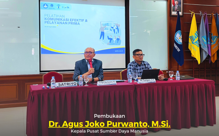 Tangerang Selatan (26-27 April 2025) - Pusat Sumber Daya Manusia UT berhasil menyelenggarakan pelatihan Komunikasi Efektif dan Pelayanan Prima secara hybrid di Aula Gedung Pusat Kualitas UT. Pelatihan ini merupakan langkah penting dalam upaya UT untuk terus berinovasi dan meningkatkan kualitas pelayanan. Pelatihan ini diharapkan dapat membawa perubahan positif dalam cara berinteraksi dan memberikan pelayanan di UT.